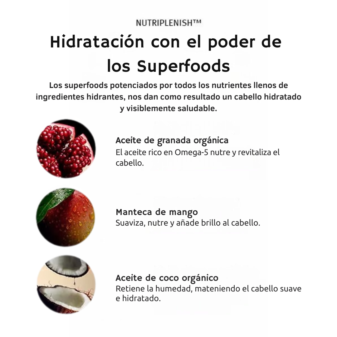 SUPERFOOD COMPLEX + ÁCIDOS GRASOS RICOS EN NUTRIENTES: SUPERALIMENTOS RICOS EN NUTRIENTES Y MANTECA DE MANGO, ACEITES ORGÁNICOS DE COCO Y GRANADA.