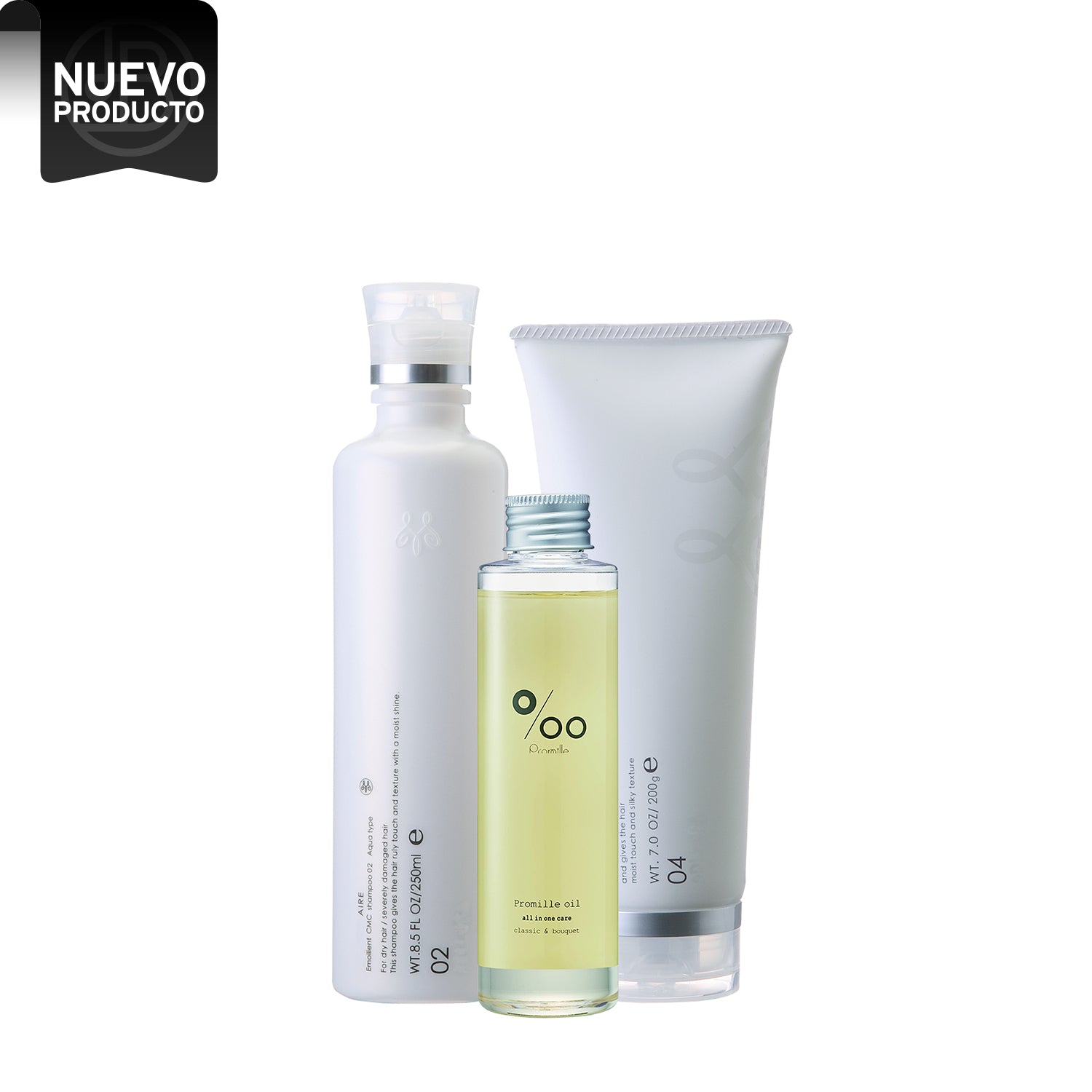 Mucota Aire 02, shampoo emoliente para cabello seco y severa-mente dañado que da al cabello una textura suave, brillo e hidratación. Mejora la textura del cabello dejándolo suave y con brillo por el efecto de sus ceramidas y el CMC.