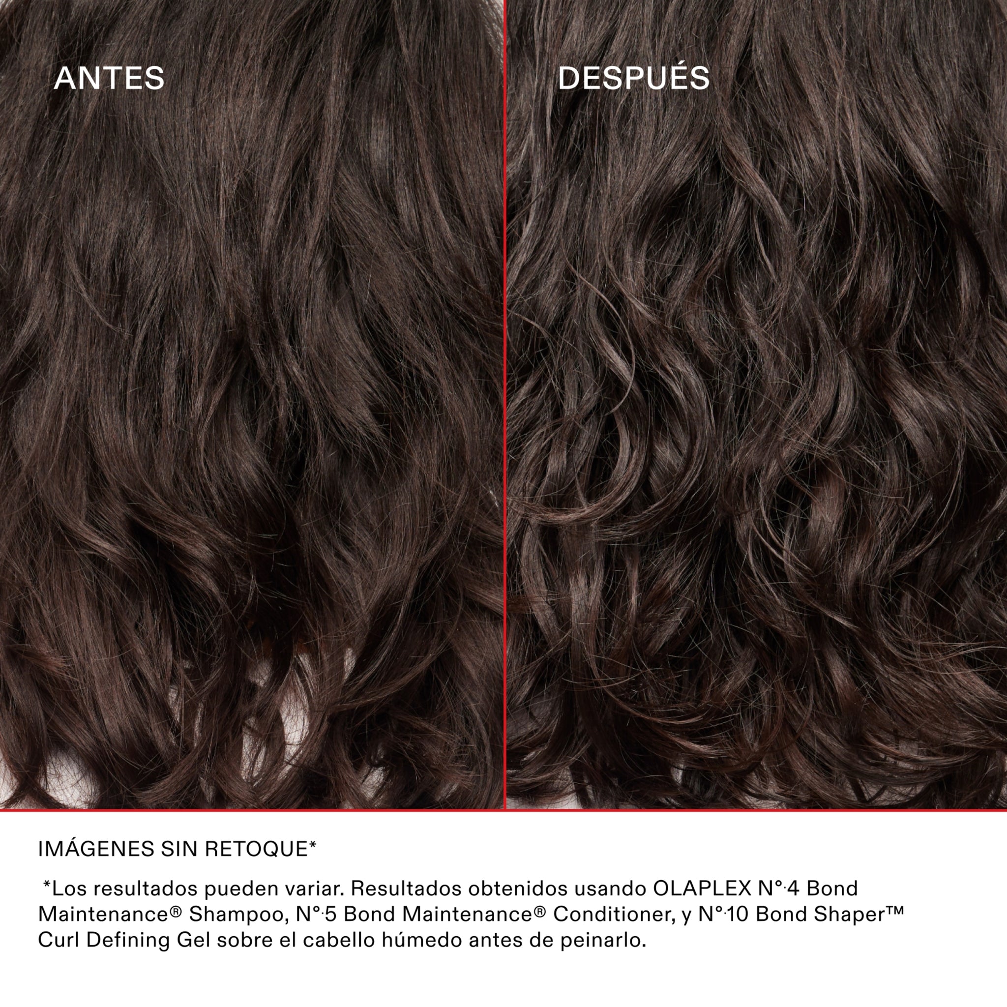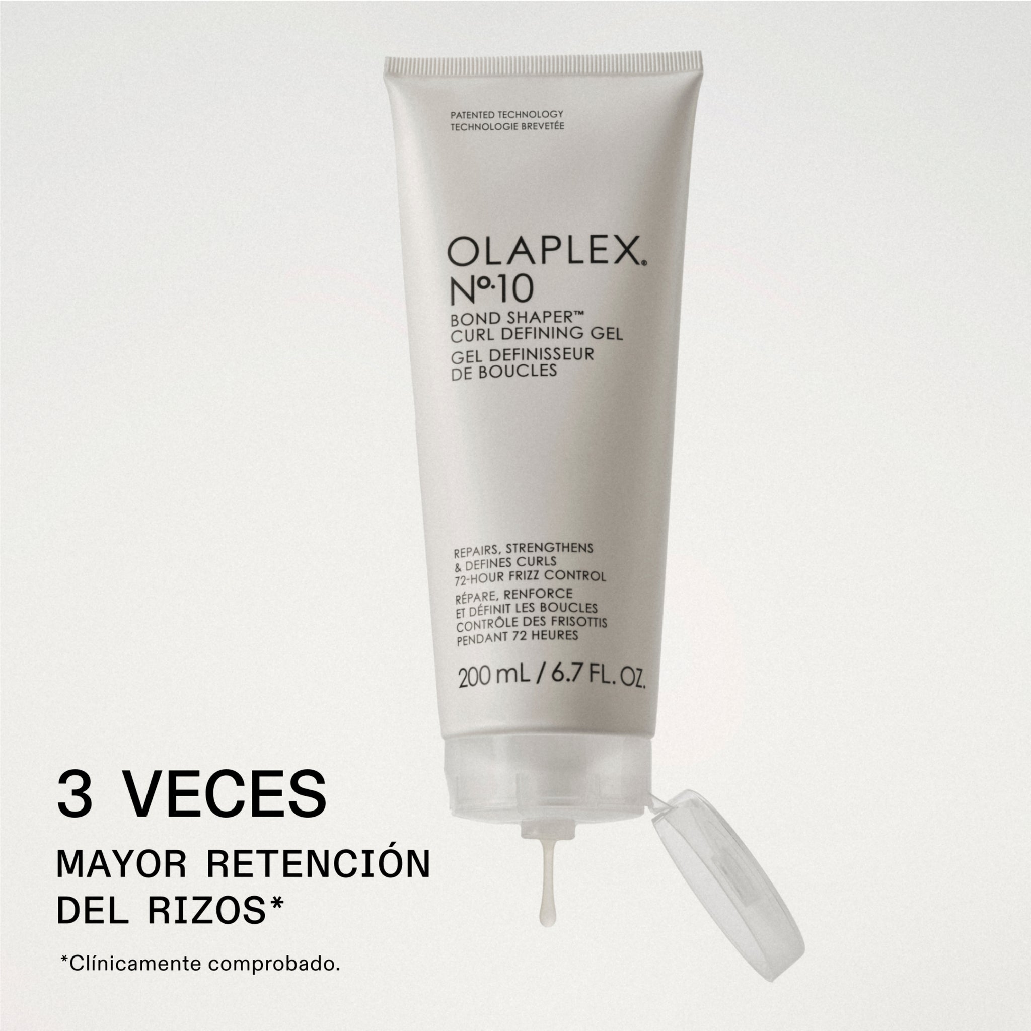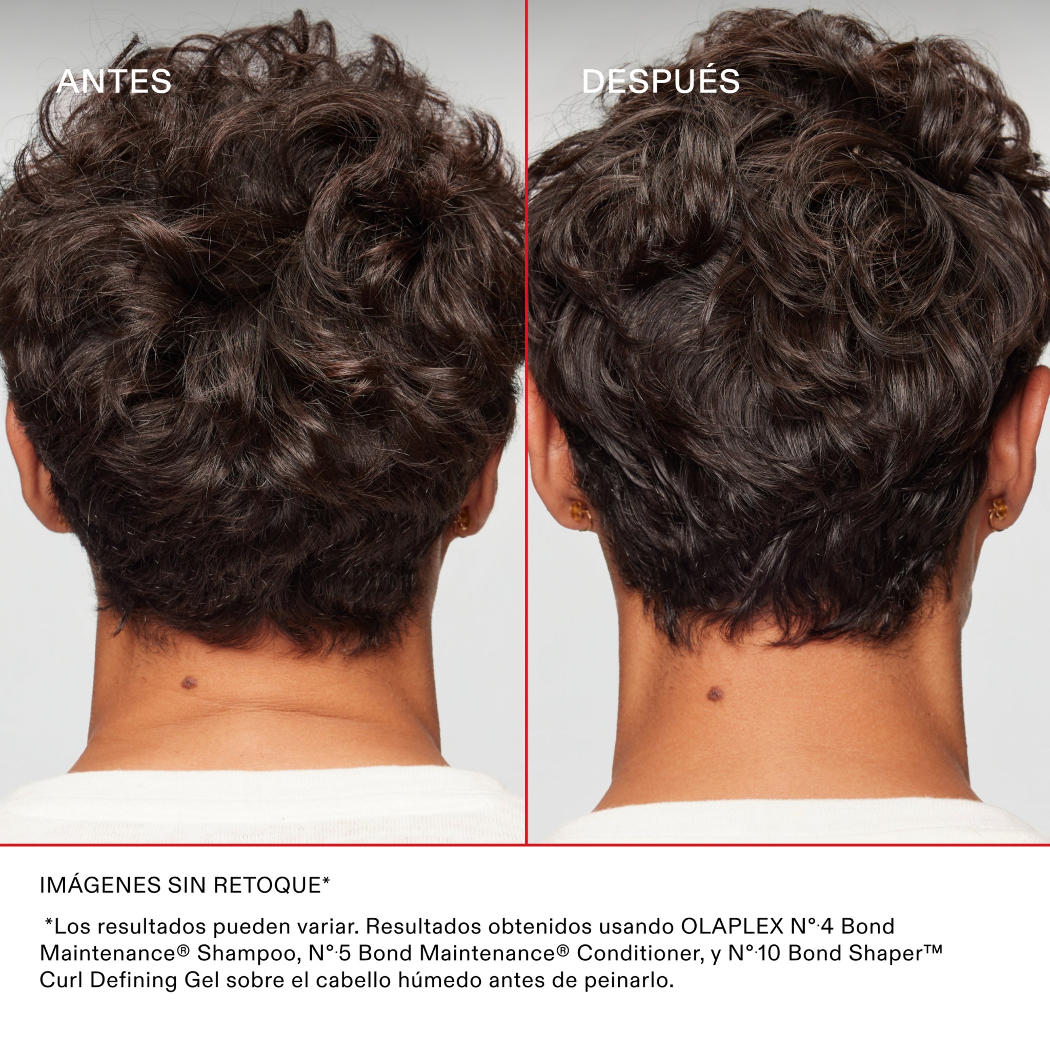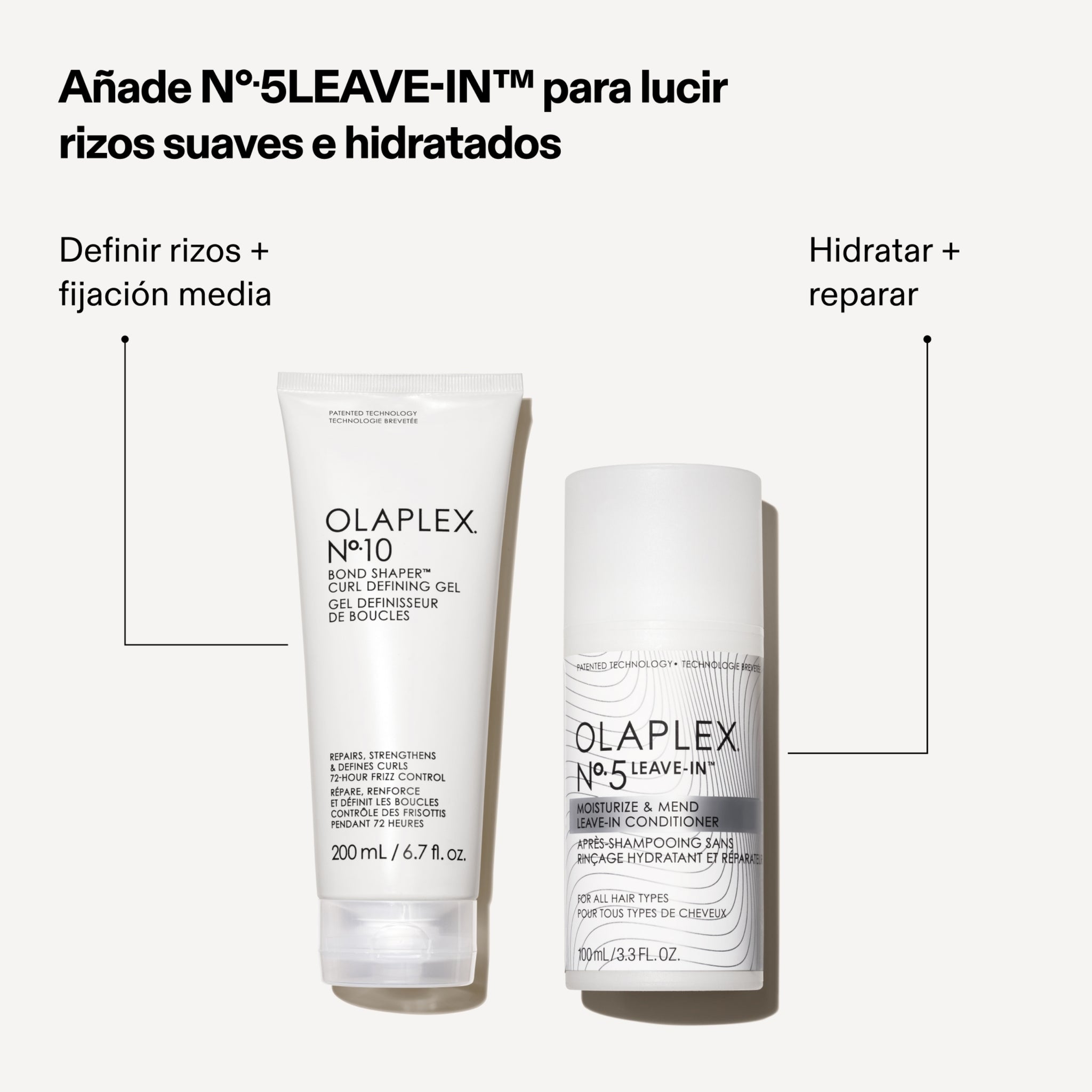 Nº.10 Bond Shaper™ Gel Definidor de Rizos ayuda a reavivar los patrones de rizos naturales en cabellos ondulados y rizados. Este gel antiencrespamiento y resistente a la humedad proporciona una fijación flexible para conseguir unos rizos suaves, lisos, hidratados y sanos sin esa sensación crujiente. OLAPLEX Bond Building Technology™ refuerza los enlaces que forman los rizos