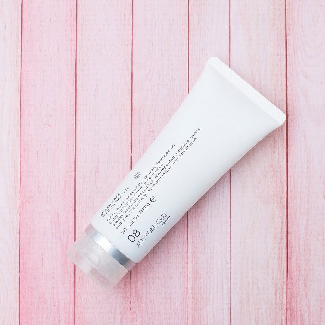 Mucota Aire 08, mascarilla de uso semanal que rescata el cabello dañado por procesos de color intenso. Contiene Colágeno, Hetatina, Miel y Complejo de Membrana Celular.